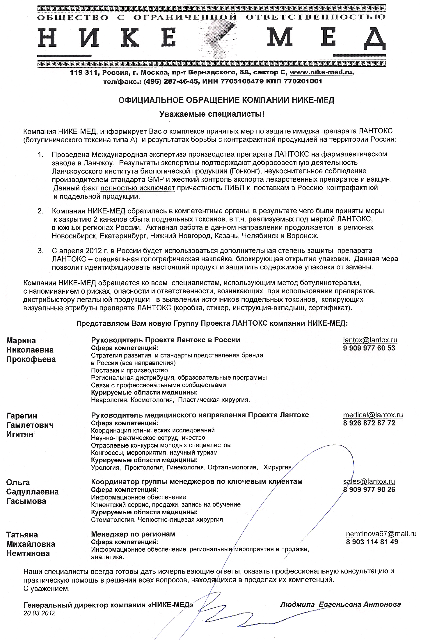 Информационное письмо компании "Нике-Мед" о комплексе мер по защите имиджа препарата ЛАНТОКС. Ознакомьтесь с официальным обращением компании "Нике-Мед".