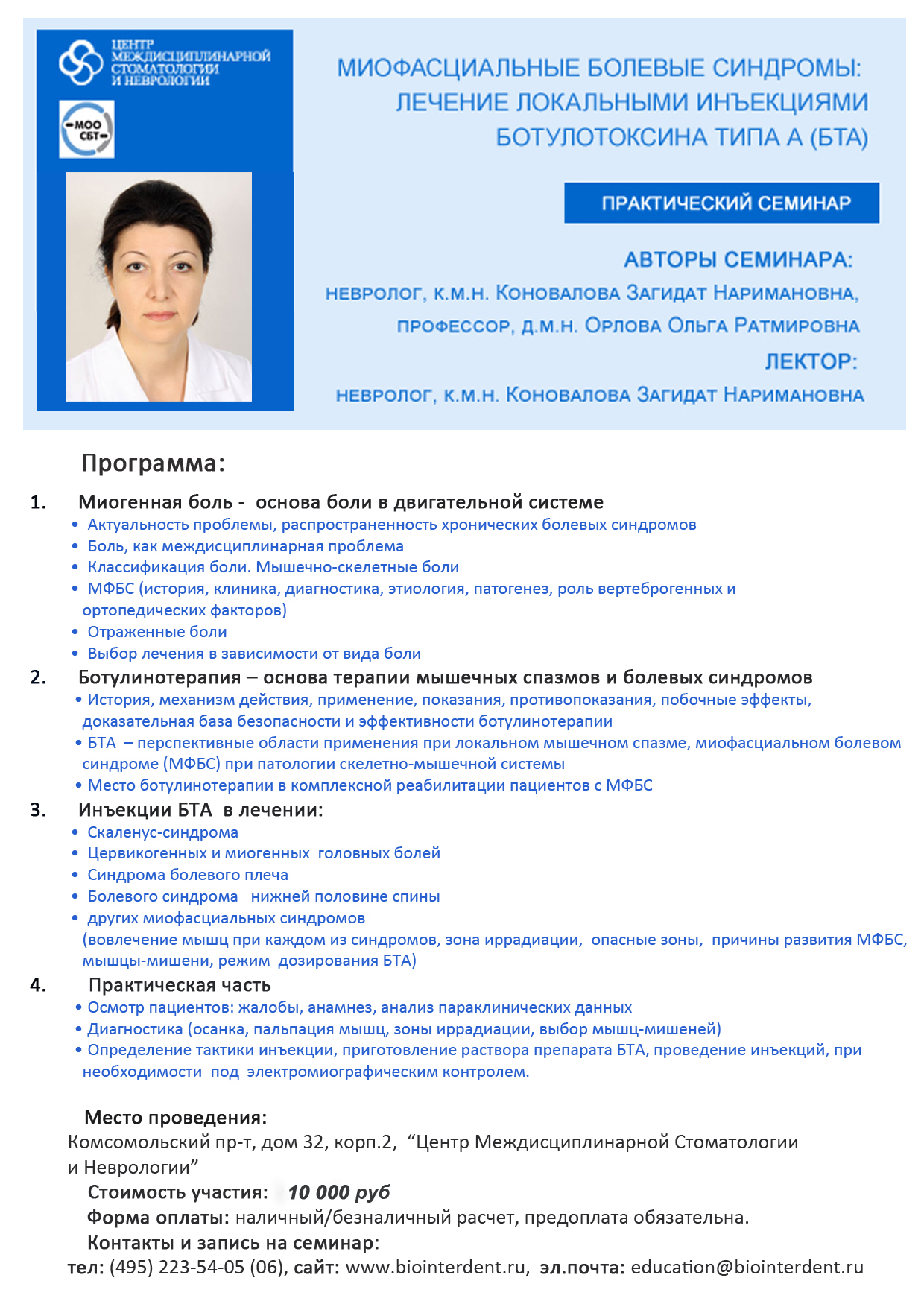 Практический семинар «Миофасциальные болевые синдромы: Лечение локальными инъекциями ботулотоксина типа А (БТА)»